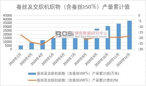 據博思數據發布的《2021-2027年中國蠶絲市場深度調研與投資前景研究報告》表明:2020年我國蠶絲及交織機織物(含蠶絲≥50%)產量累計值達38349.5萬米,期末產量比上年累計下降18.3%。